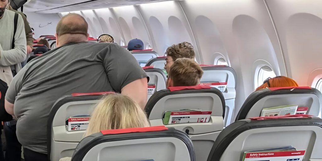 Letadlo bylo téměř plné. Cestující hledali svá místa, někteří zápasili s příručními zavazadly, jiní netrpělivě čekali, až se uvolní ulička. V tu chvíli si muž v šedém tričku sedl na krajní sedadlo. Bylo hned jasné, že se od ostatních liší — svou velikostí.