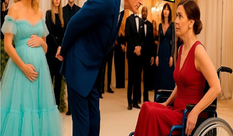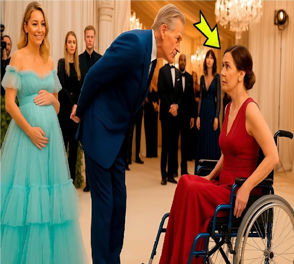 Uprostřed celé scény stál muž v modrém obleku. Po jeho boku stála mladá těhotná žena, krásná a usměvavá v azurových šatech. A před nimi — v rudých šatech na invalidním vozíku — seděla jeho manželka. Nehybná, ale hrdá. A když se muž sklonil k jejímu obličeji, všechno se změnilo.