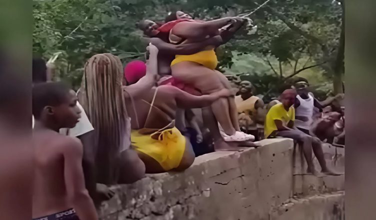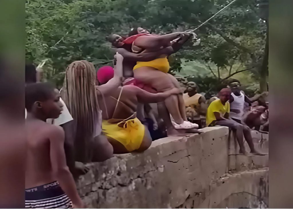 Dvě ženy, obě v barevných plavkách, stojí na okraji mostu. Jedna sedí na druhé, obě drží silné lano visící z větve stromu. Pod nimi: voda. Možná klidná, možná s kameny. Kolem nich: davy lidí. Někteří se smějí, jiní natáčejí. Někdo vypadá pobaveně, jiný znepokojeně. Jakoby všichni cítili, že tahle chvíle nemusí skončit dobře.
