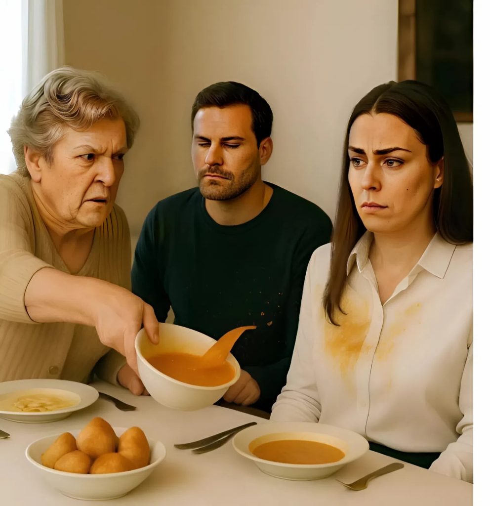 Miska horké polévky proletěla stolem a vylila se jí přímo na hrudník.