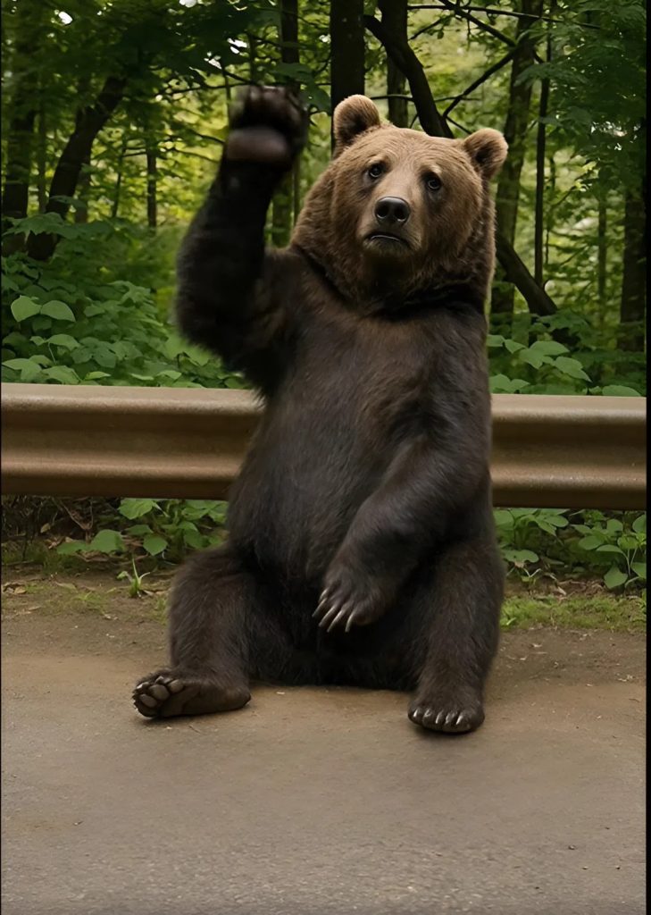 Na první pohled to vypadalo jako kus spadlého dřeva u kraje. Ale něco mě přimělo zpomalit. A když jsem se přiblížil, pochopil jsem: nebylo to dřevo. Byla to medvědice. Seděla přímo u krajnice na zadních tlapách – a mávala. Skutečně mávala tlapou, jakoby mě chtěla zastavit.