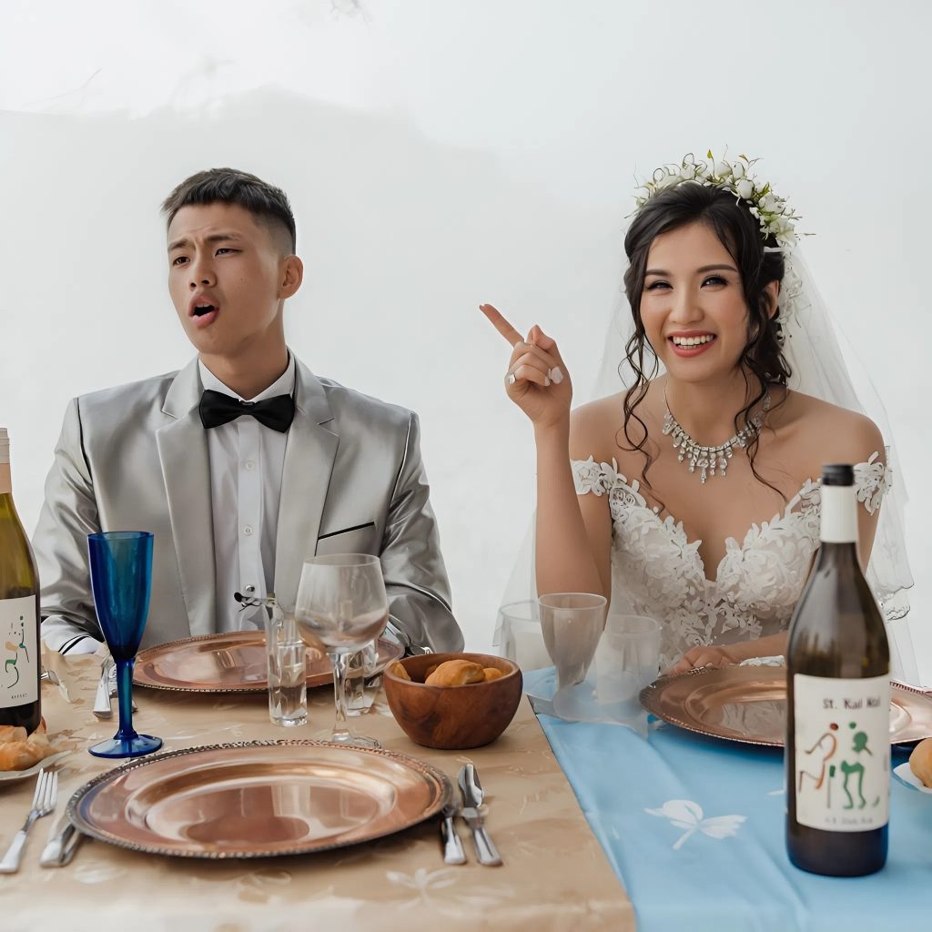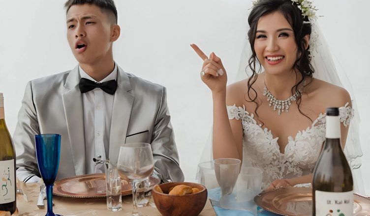 Nevěsta si zakryla obličej rukama, rozpolcená mezi úlevou a rozpaky. Ženich se nervózně zasmál a pevně ji objal.
