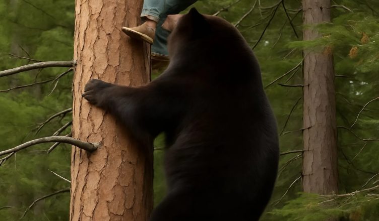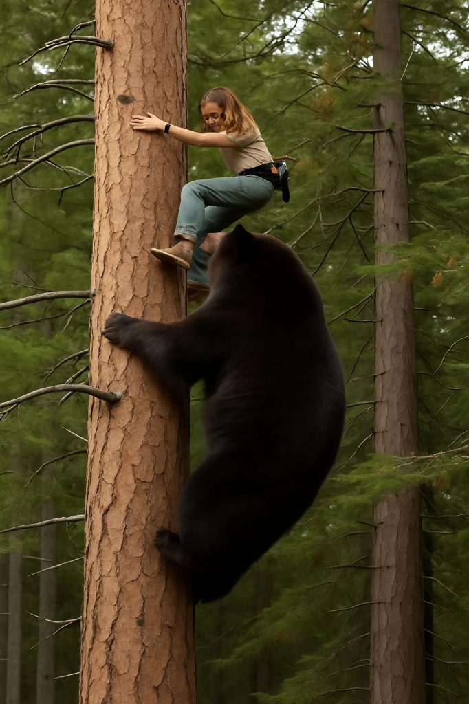 Náhle medvěd začal šplhat. Mnozí si myslí, že dospělí medvědi neumějí lézt po stromech, ale pokud jsou dost motivovaní, dokážou se vytáhnout překvapivě vysoko. Žena v hrůze sledovala, jak se k ní kolos pomalu přibližuje.