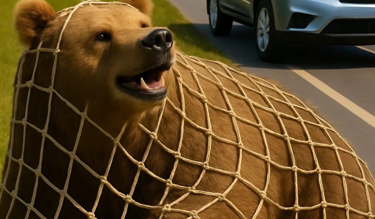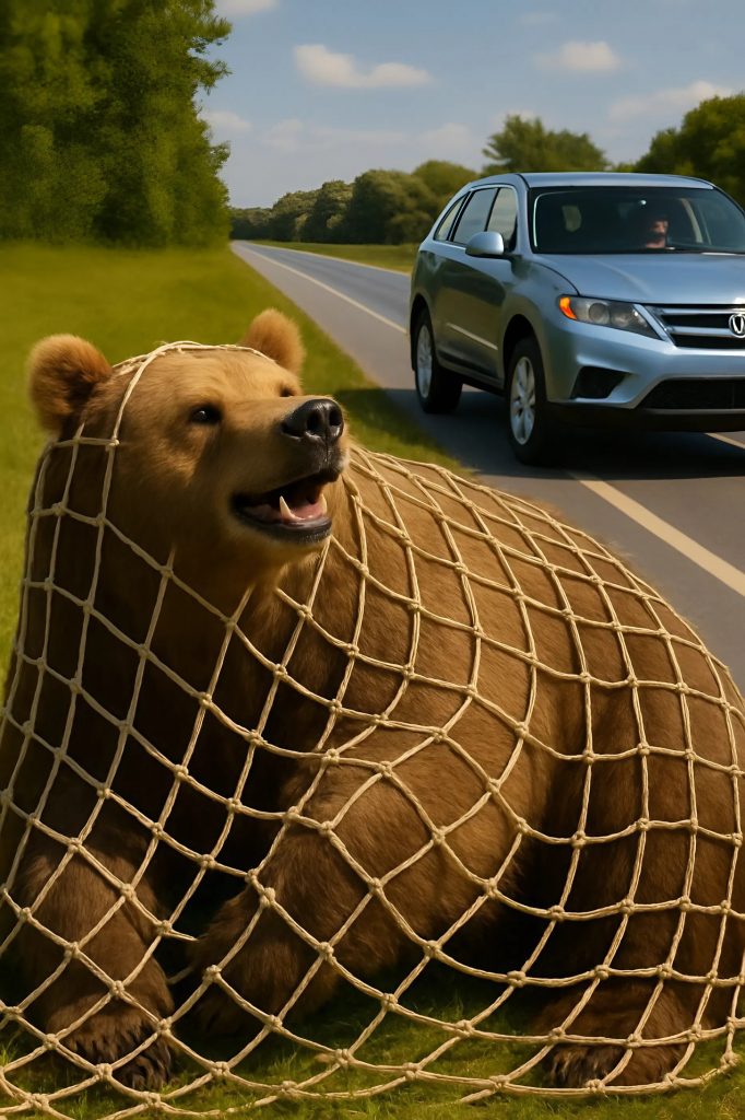 Nejprve jsem zahlédl hnědou skvrnu u krajnice. Myslel jsem, že je to jen stín nebo možná vyhozený odpad. Když jsem se však podíval pozorněji, ztuhl jsem: byl to medvěd. Obrovský, mocný tvor, a přesto úplně bezmocný. Jeho tělo bylo sevřené v husté síti, provazy se mu zařezávaly do srsti i končetin. Těžce oddechoval, chrčel a jeho hluboké zvuky nezněly výhružně, spíše jako prosba o pomoc.
