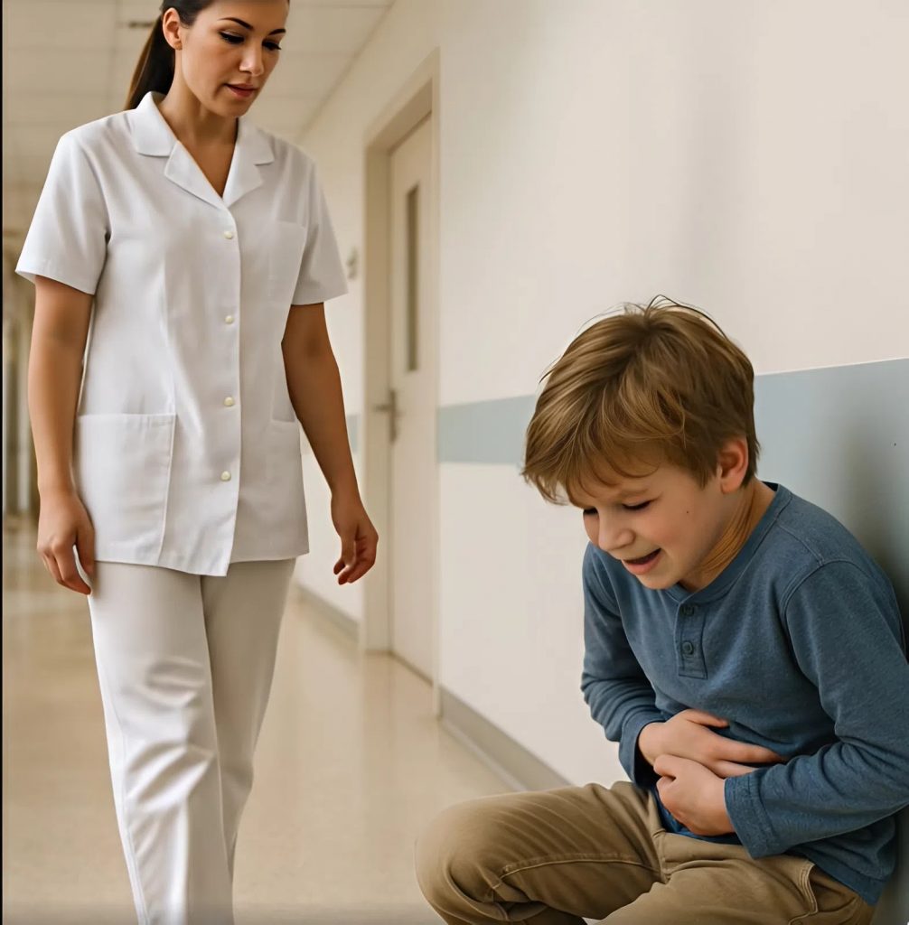 „Mně… strašně bolí… břicho,“ zašeptal slabým hlasem, sotva stojíce na nohou.
