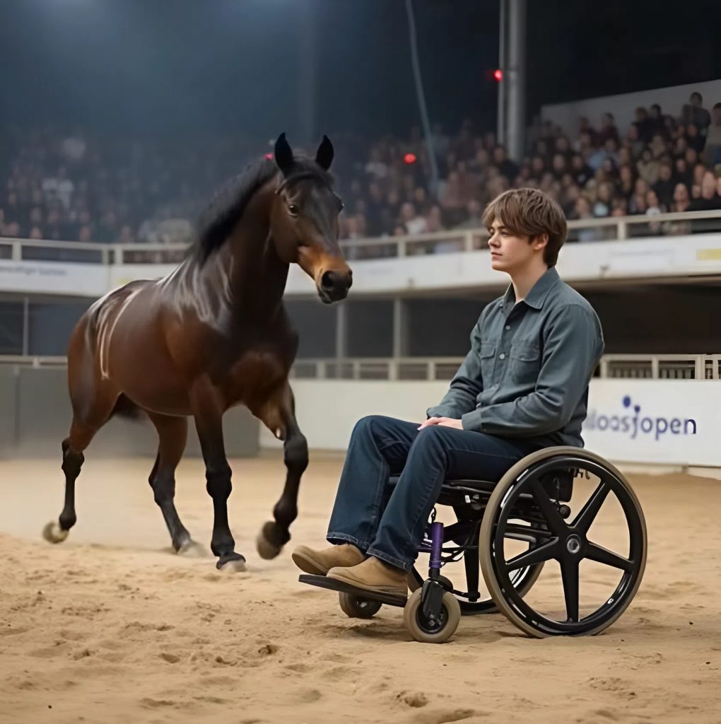 Zatímco diváci ohromeně sledovali, těžké dveře arény se pomalu otevřely. V tichu se objevil mladík na invalidním vozíku. Jistě se odrážel rukama, každý jeho pohyb byl plný odhodlání. Celý sál ztichl. Lidé nevěřili svým očím — jako by se čas zastavil. Když mladík zvedl pohled, atmosféra se změnila. V jeho očích bylo klid, jistota a síla, kterou slova nedokážou popsat. Všechno kolem ztuhlo — jako by svět čekal na něco velkého. Nikdo nevěděl, co přijde. Ani on ne. Ale všichni cítili — že se děje něco výjimečného.