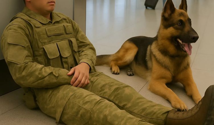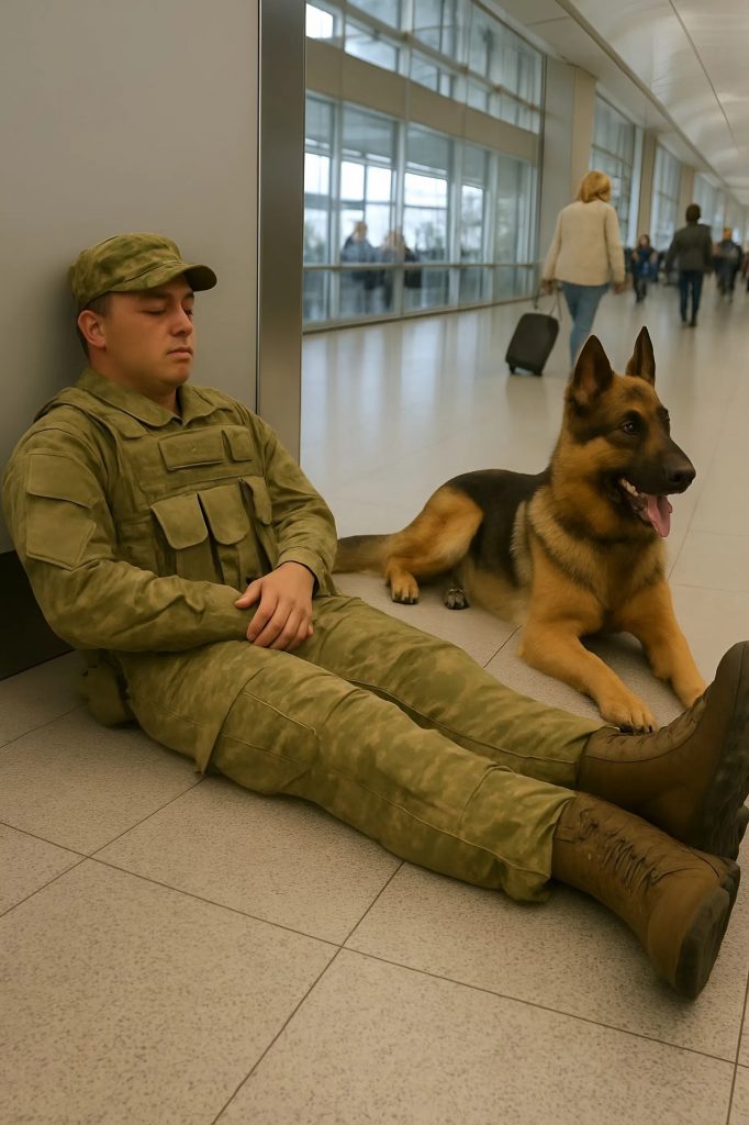Mladý muž, sotva dvacetiletý, spal přímo na studené podlaze. Jeho úhledná uniforma prozrazovala vojáka: ošoupané rukávy, stopy dlouhých cest, lehký prach na botách. Vedle něj ležel batoh, který už zjevně mnohé zažil. Ruce měl pod hlavou jako pod polštářem a nehýbal se. Ale pohled všech byl upřen nikoli na něj, nýbrž na psa — německého ovčáka, který stál po jeho boku. Jeho srst se leskla pod světly a v očích se zračila napjatá ostražitost. Stál mezi svým pánem a světem, bedlivě sledoval každého, kdo se odvážil přiblížit. Když někdo přišel příliš blízko, z jeho hrudi se ozvalo tiché, varovné vrčení. Nebyl to projev zlosti — byla to neochvějná oddanost.