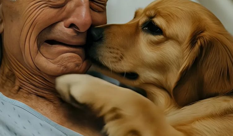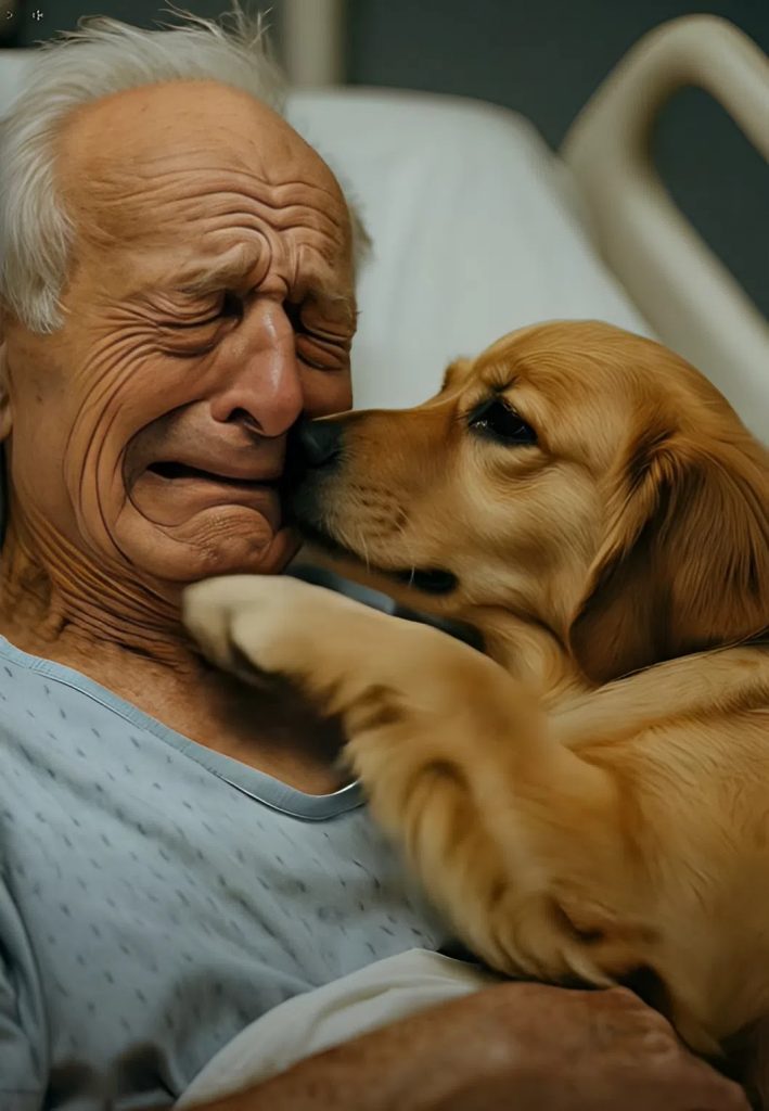 O dvě hodiny později se u nemocničního vchodu ozval tichý štěkot. Byl to Ritchie — hubený, s šedivou tlamou, unavený, ale s očima plnýma lásky. Sestra otevřela dveře pokoje — a pes bez váhání vyskočil na postel. Jemně se stočil na hruď svého pána a položil hlavu na jeho rameno.