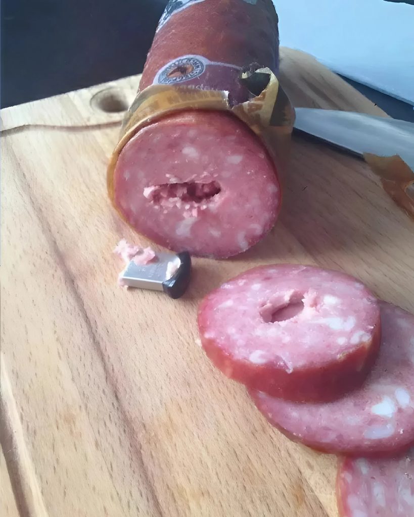 Když jsem si chtěl připravit snídani, vytáhl jsem stejnou kolbásu a začal ji krájet. Jenže nůž se zarazil – něco v ní bylo tvrdé. Nejprve jsem si myslel, že je zmrzlá, ale když jsem odřízl další kousek, zůstal nůž stát. Podíval jsem se pozorně – a ztuhl. Uprostřed masa se něco zablesklo.