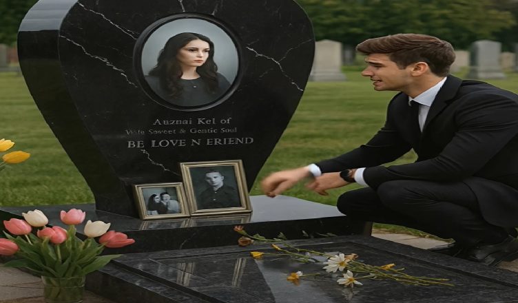 Před ním stál velký černý náhrobek ve tvaru srdce. Její fotografie, jemný úsměv, čerstvé květiny. Bylo vidět, že sem někdo pravidelně chodí.