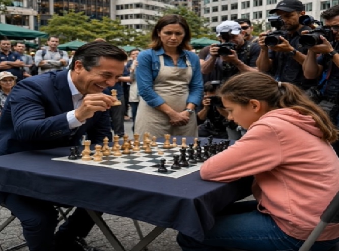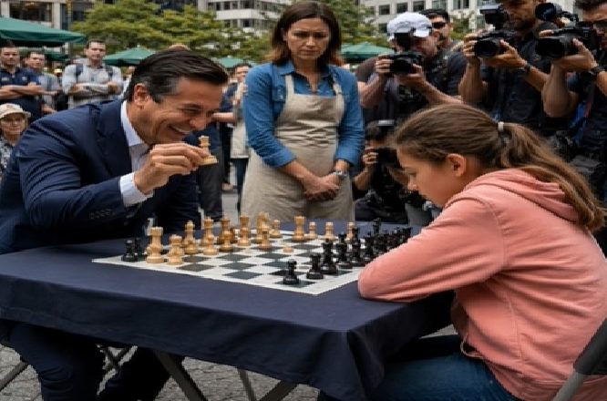 Uprostřed davu stál známý miliardář Arsen Markov. Jeho jméno si lidé už dávno nespojovali s respektem, ale se strachem. Kupoval si všechno — podniky, vliv, mlčení lidí i cizí vítězství. Dnes připravil další ponižující představení: obrovský stůl, drahé ručně vyrobené šachy, kamery novinářů, ochranku kolem dokola a kufr plný peněz, postavený vedle něj tak, aby všichni viděli slíbenou částku.